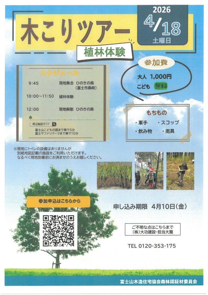 2009年から開催の「木こりツアー」も今年で17年目を迎えます。われわれ富士山木造住宅協会森林認証材委員会のこの木こりツアーを含めた富士山地域材活性化プロジェクトが、消費者目線での新たな木づかいを促進するウッドデザイン賞2016に入賞いたしました。【原木供給者】である日本製紙㈱、㈲植松林業、㈲まるいチップ工業、㈱ソマウッド、【製材・プレカット】の㈱マルダイ、(有)まるいチップ工業、【工務店】の弊社㈱大功建設他、【住宅取得者】のお客様が一体となり、富士山麓に豊富にある地域材の普及に向けて継続的に活動を続けてきた証です。「富士山檜輝」というブランドを立ち上げ、SGECの認証材の柱や土台が、いつ・どこの山で採られたのかが分かるようにトレサビリティーを管理しているため、木こりツアーにてご自宅での柱として使われるかもしれない木々が生息する山を見に行くことは、大変意味のあることになります。そんなSGECの山で、カーボンニュートラルへの取り組みの第一歩となうるヒノキの苗木の植林を体験していただきます。 50~60年後、もしかしたらお子さん達は自分で植えたヒノキを使った家づくりが出来るかもしれませんね。大自然と触れ合いながら森林への関心を深め、その大切さを学びとる”木育”を目的とした「木こりツアー」に、どうそお気軽にご参加ください。