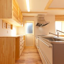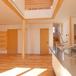 お施主様が思い描いた間取りを、ほぼそのまま取り入れられるほど、リアルな生活スタイルが創造されていました。家具や間取りにも目的に応じた明確なこだわりがあり、造り上げていく我々も生活をイメージしながらの仕事ができ、とてもやりがいのあるお宅でした。お子様の成長に合わせて間仕切ることが出来るように可変性を持たせた間取りで、お子様が小さい時の、のびのび暮らしている姿が目に浮かびます。外壁はブルーのガルバリウムをメインに使用し、サッシと漆喰塗壁の白がとてもアクセントになっています。