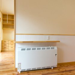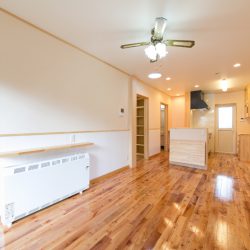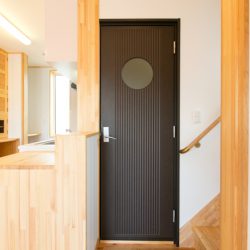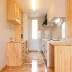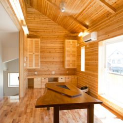 外壁にガルバリウム鋼板・漆喰塗壁・無垢板貼りを使用し、屋根のオレンジカラーと、ベランダ腰羽目のオレンジの色が良く映える二世帯住宅です。玄関は1つですが、動線を上手く利用しました。二階には防音室も設けられています!そのほか、ご好評を頂いている大功造付オリジナル家具や話題のスカイライトチューブ(改良型)も設置してあります。国産材の無垢の木をふんだんに使用した200年住宅です。
