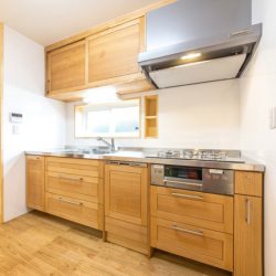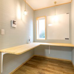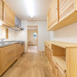 Y様邸のスケルトンリフォームのポイントは、耐震改修と共に床・壁・屋根の断熱改修を行う性能リフォームと、キッチン・浴室・洗面・トイレ等を新しいものに交換する水廻りリフォームを全て行う、ほぼ新築に近いリフォーム内容。玄関土間の洗い出しの部分をそのまま残したいというお客様のご要望、撤去出来ない柱の関係で、間取りが大きく変わることはありませんでしたが、高断熱・高気密の住宅の特性を生かす意味でも、開放感のある、生活動線を考えた間取りをご提案しました。家族が集うLDKに2人のお子様用に学習コーナーを設け、奥様の家事中も目が届くようにし、キッチンの奥には奥様専用の家事室を今回新たに計画し、キッチンは家具職人さんによる完全オーダー手造りキッチン!床の栗とよく合い存在感は抜群です。大功オリジナル家具の食器棚が取り付けられて使いやすい設計となりました。