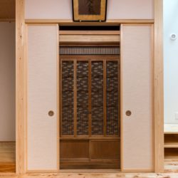 創業100年を超える老舗の艾(もぐさ)店・小山忠次郎商店。歴史を刻み風情を醸し出していた建物を取り壊しての建替えです。お施主様から、昔の趣を残しつつ古材を再利用した家づくりをして欲しいという依頼があり、古いお宅で使われていた欅の大黒柱とお店の框、松の大梁を再利用し、それ以外は静岡県内産杉ヒノキをふんだんに使用しました。街中のコンクリートビルの中で心地良い木の香りがとても貴重で贅沢です。間口2間半、奥行11間という建物形状と、準防火地域という用途規制もクリアーし、耐震等級も最高ランク3の長期優良住宅。大功の家のこだわりも凝縮した建物です。新しく生まれ変わった新築の建物ですが、昔からそこにあったかのような歴史を継承した佇まいになりました。