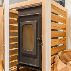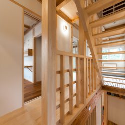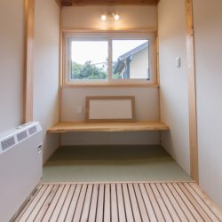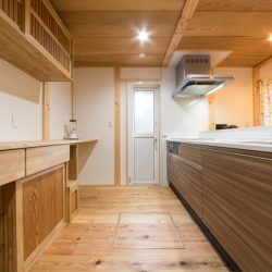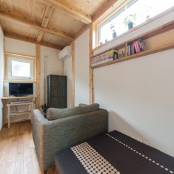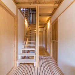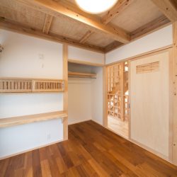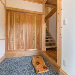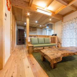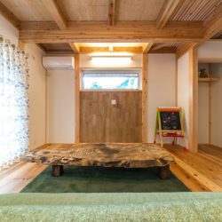 地元の木を使い、地産池消の家づくりを実践した興津川木の家プロジェクトの家。自ら設計し、自ら清水の山に行き、自ら木を切り、自ら大工として家を建てるという、とても夢のある家づくりです。建具も家具も外構も、全て自らが設計し、造り上げたもの。25坪ほどのコンパクトな家ですが、視覚的に木視率が高く“抜け”感があり、狭さを全く感じさせません。外断熱の家で、床下から小屋裏も余すところなく活用できているので、居住スペースには必要なだけの収納を設けるだけで済みました。これまでの大功の家のベースとなっている、長期優良住宅、住宅性能表示制度の活用、しずおか優良木材支援制度の活用、内装材の静岡市産材の利用、SGEC森林認証材の利用等はこれまで通り行っています。天井の梁の表し、漆喰の塗壁、ペレットストーブの採用で、これまでの大功の家とは違ったテイストを感じて頂ける家となりました。ダークグリーンのガルバリウムの外観も周りの山々との景観に良くマッチしています。